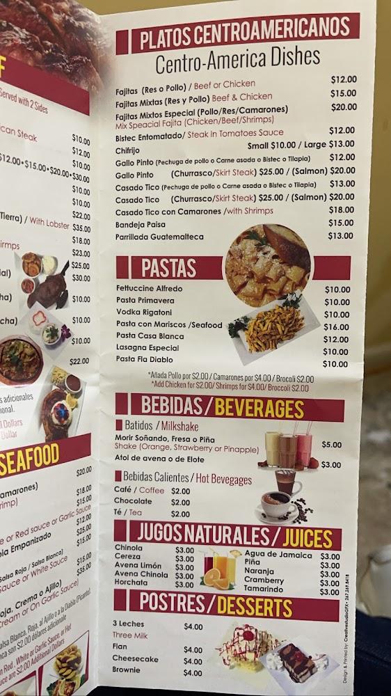 The menu at Casablanca Restaurant is extensive and rich in flavor. It features over 100 dishes, showcasing authentic Central American cuisine. Classic meals include Bistec Encebollado, Sopa De Res, and Picadera Tica. Vegetarians can also enjoy choices like Fettuccine Alfredo or hearty salads. Lighter bites include a variety of appetizers perfect for sharing. Each dish represents a fusion of taste and tradition. The dessert menu boasts crowd favorites like Flan and Cheesecake. Hot beverages, fresh juices, and a selection of cocktails pair well with meals, enhancing the culinary journey. The meals cater to all ages, with a children's menu available. This diverse selection guarantees satisfaction regardless of preference.